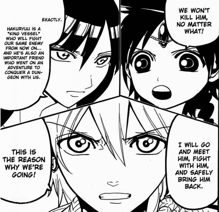 Sharrkan says that Hakuryuu was probably going to attack Balbadd now. Aladdin says that no matter what happens, they will not kill Hakuryuu. Mor says that Hakuryuu is a King Vessel who will fight a common enemy with them and he was also an important friend who went to capture a dungeon with them. Alibaba says that they will go, fight him, and bring him back.